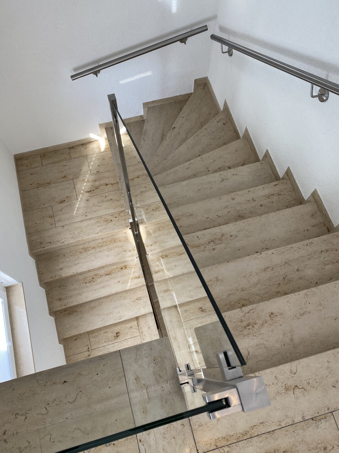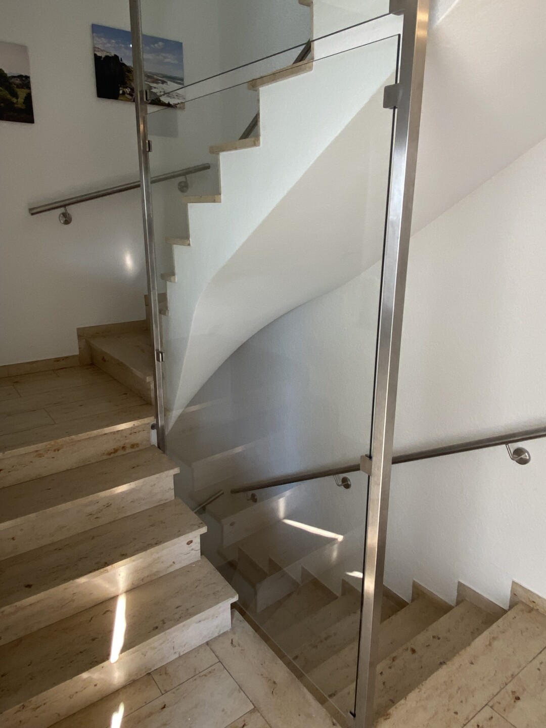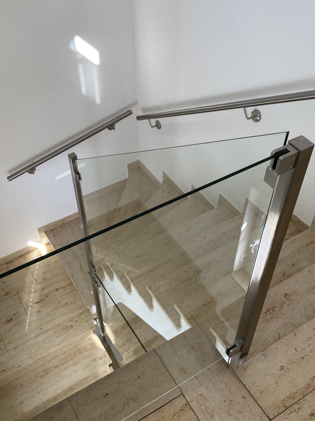 Treppengeländer für mehrstöckigen Hausflur, Edelstahl mit Klarglaselementen, Handläufe aus Edelstahl